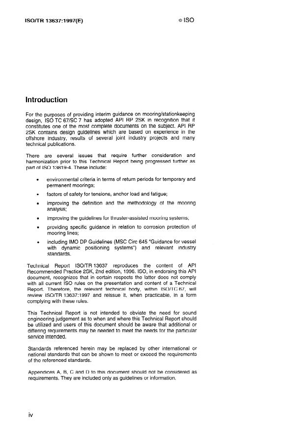 ISO/TR 13637:1997 is a technical report published by the International Organization for Standardization (ISO). Its full title is "Petroleum and natural gas industries — Mooring of mobile offshore drilling units (MODUS) — Design and analysis". This standard covers: Petroleum and natural gas industries — Mooring of mobile offshore drilling units (MODUS) — Design and analysis