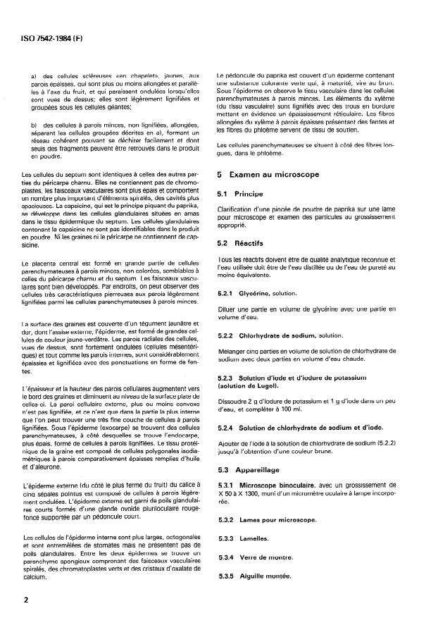 ISO 7542:1984 is a standard published by the International Organization for Standardization (ISO). Its full title is "Ground (powdered) paprika (Capsicum annuum Linnaeus) — Microscopical examination". This standard covers: Gives a detailed description of the morphological and anatomical structure of paprika and specifies a method of examination consisting in clarifying a pinch of ground paprika on a microscope slide and examining the particles under appropriate magnification.