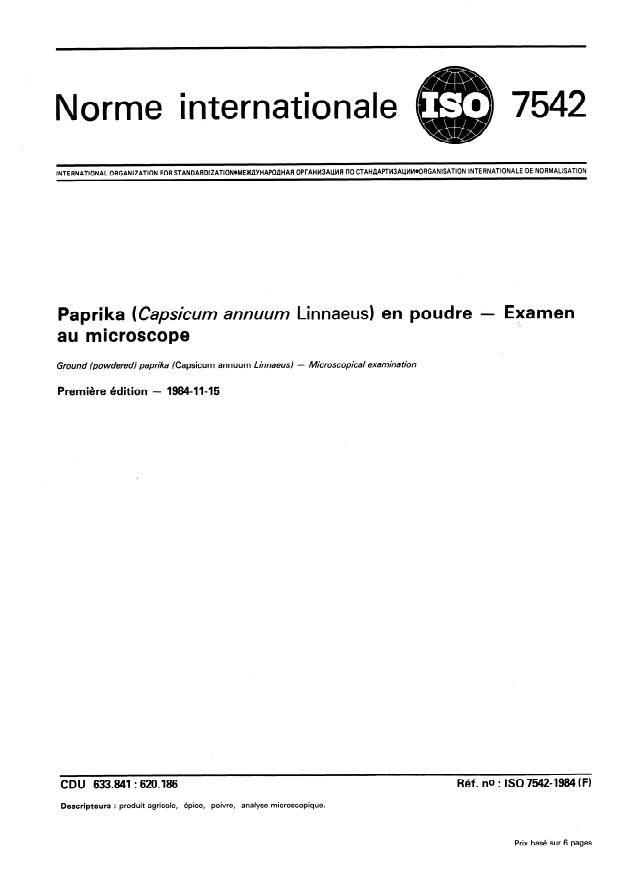 ISO 7542:1984 - Paprika (Capsicum annuum Linnaeus) en poudre -- Examen au microscope