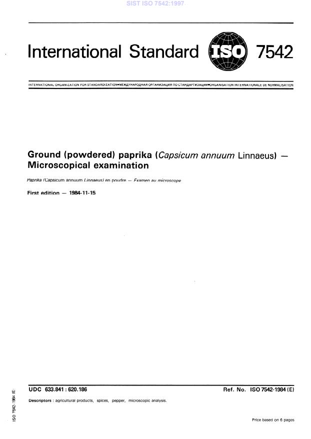 ISO 7542:1984 - Ground (powdered) paprika (Capsicum annuum Linnaeus) -- Microscopical examination