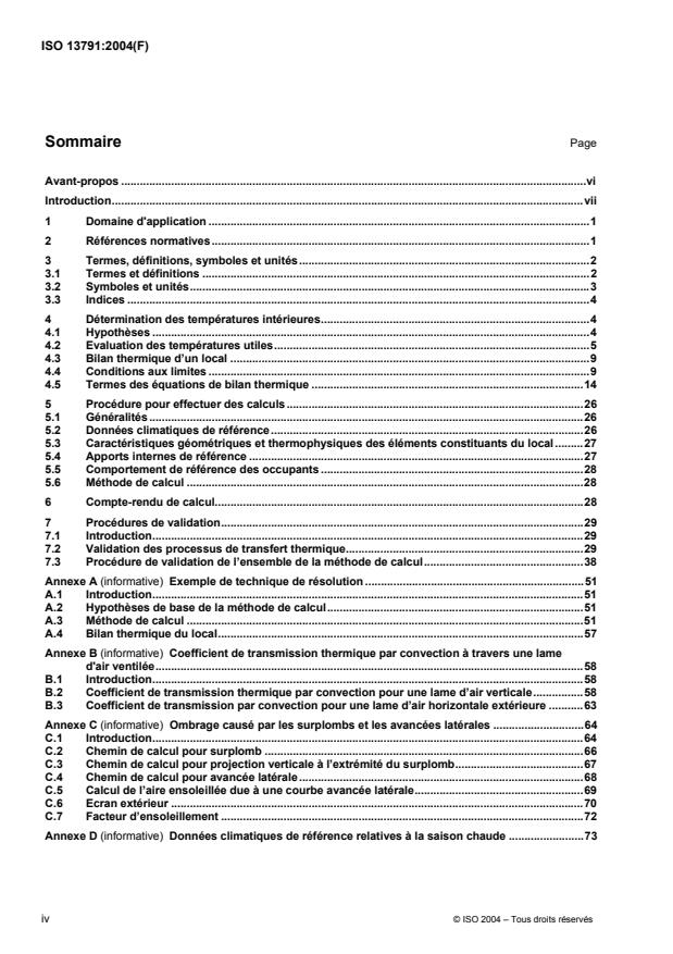 L'ISO 13791:2004 spécifie les hypothèses, conditions aux limites, équations et essais de validation à adopter pour une méthode de calcul, en régime transitoire horaire, des températures intérieures (de l'air et de service) pendant les périodes chaudes, d'un seul local dépourvu d'installation de refroidissement/chauffage en service. L'ISO 13791:2004 n'impose aucune technique numérique particulière. Les essais de validation sont compris. Un exemple de technique de résolution est donné en Annexe A. L'ISO 13791:2004 ne renferme pas suffisamment d'information pour définir une procédure capable de déterminer les conditions internes de zones spéciales telles que: solariums, atriums, éléments solaires passifs indirects (murs capteurs à stockage thermique ou murs Trombe, panneaux solaires) et zones dans lesquelles le rayonnement solaire peut traverser le local. Dans de telles situations, il est nécessaire de disposer de diverses hypothèses et de modèles de résolution plus détaillés.