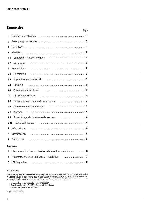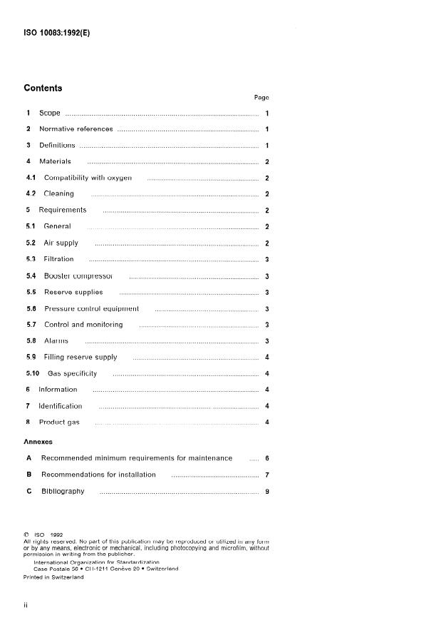 ISO 10083:1992 is a standard published by the International Organization for Standardization (ISO). Its full title is "Oxygen concentrators for use with medical gas pipeline systems". This standard covers: Specifies requirements for a concentrator system including a reserve supply, for use with medical gas pipeline systems which comply with ISO 7396, comprising a pressure swing adsorber system and its source of air supply. Includes requirements for safety, quality, purity and availability of supply. Also specifies the air source for oxygen concentrators. Annexes A and B describe recommended minimum requirements for maintenance and recommendations for installation.