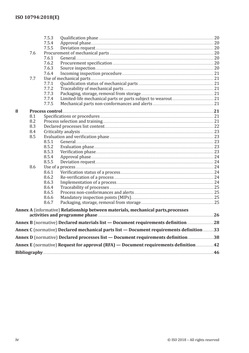ISO 10794:2018 organizes requirements around a Materials, Mechanical Parts and Processes (MMPP) programme and includes: