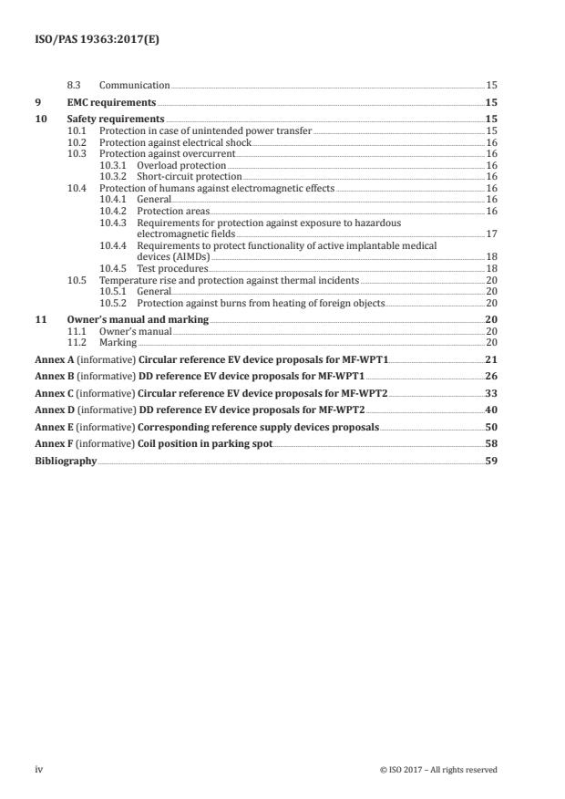 ISO/PAS 19363:2017 is a technical specification published by the International Organization for Standardization (ISO). Its full title is "Electrically propelled road vehicles — Magnetic field wireless power transfer — Safety and interoperability requirements". This standard covers: ISO/PAS 19363:2017 defines the requirements and operation of the on-board vehicle equipment that enables magnetic field wireless power transfer (MF-WPT) for traction battery charging of electric vehicles. It is intended to be used for passenger cars and light duty vehicles. ISO/PAS 19363:2017 addresses the following aspects for an EV device: - transferred power; - ground clearance; - interoperability requirements among differently classified EV devices and associated off-vehicle systems; - performance requirements under various conditions, including among different manufacturers and classifications; - safety requirements; - test procedures. EV devices according to ISO/PAS 19363:2017 are intended to operate with off-board systems currently under development in the IEC 61980 series. NOTE 1 This edition covers stationary applications. NOTE 2 Bidirectional power transfer is not considered in this edition.