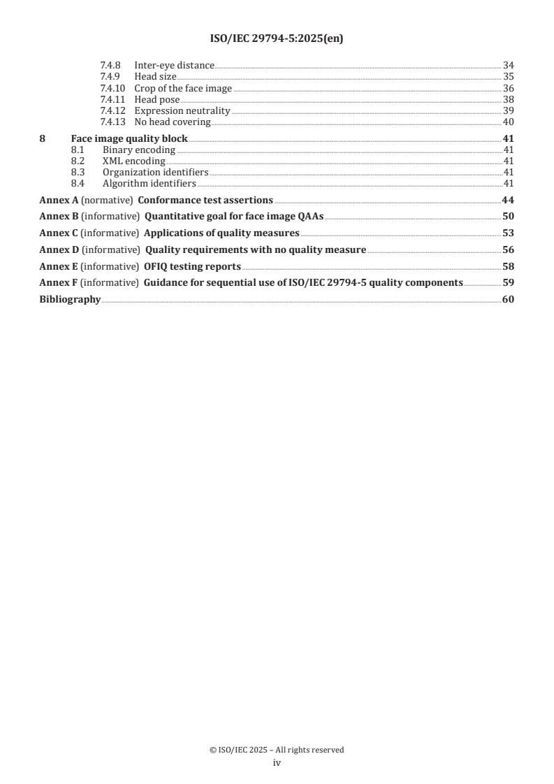 ISO/IEC 29794-5:2025 is a standard published by the International Organization for Standardization (ISO). Its full title is "Information technology - Biometric sample quality - Part 5: Face image data". This standard covers: This document establishes requirements on implementations that quantify how a face image’s properties conform with those of canonical face images, for example those specified in ISO/IEC 39794-5:2019, Clause D.1, for three use-cases: 1) collection of reference samples for ID documents; 2) sample system enrolment; and 3) probes for instantaneous response. This document also establishes terms and definitions for quantifying face image quality and specifies methods for quantifying the quality of face images. This document does not establish requirements on: - assessing the quality of pairs or sequences of images; NOTE This document establishes requirements for software that inspects exactly one image. This document does not establish requirements for software that compares two or more images (such as biometric recognition). However, the computations of this document can be applied separately to each image in a pair or sequence. - assessing the quality of 3D captures; - encodings of face image quality data; - performance evaluation of face image quality assessment algorithms. The use cases within scope of this document primarily address the assessment of images from data capture subjects who consent to processing of their biometric data, or for whom biometric capture is operationally authorized.