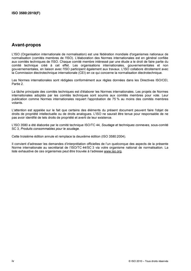 L'ISO 3580:2010 spécifie les exigences relatives à la classification des électrodes enrobées, d'après le métal fondu hors dilution à l'état traité thermiquement, pour le soudage manuel à l'arc des aciers ferritiques et martensitiques résistant au fluage et des aciers faiblement alliés pour usage à haute température. L'ISO 3580:2010 propose une spécification mixte permettant une classification utilisant un système fondé soit sur la composition chimique du métal fondu hors dilution, avec des exigences portant sur la limite d'élasticité et l'énergie de rupture pour le métal fondu hors dilution, soit sur la résistance à la traction et la composition chimique du métal fondu hors dilution. Les paragraphes et les tableaux portant le suffixe «A» sont applicables uniquement aux électrodes enrobées classifiées d'après le système basé sur la composition chimique, avec des exigences portant sur la limite d'élasticité et l'énergie de rupture pour le métal fondu hors dilution conformément à l'ISO 3580:2010. Les paragraphes et les tableaux portant le suffixe «B» sont applicables uniquement aux électrodes enrobées classifiées d'après le système basé sur la résistance à la traction et la composition chimique du métal fondu hors dilution conformément à l'ISO 3580:2010. Les paragraphes et les tableaux ne portant ni le suffixe «A» ni le suffixe «B» sont applicables à toutes les électrodes enrobées classifiées conformément à l'ISO 3580:2010. Afin de permettre des comparaisons, certains tableaux comportent des exigences relatives aux électrodes classifiées selon les deux systèmes, ce qui place des électrodes particulières, ayant des compositions et des propriétés similaires des deux systèmes, sur des lignes adjacentes de ces tableaux. Sur une ligne particulière du tableau ayant un caractère obligatoire dans l'un des systèmes, le symbole affecté à l'électrode similaire de l'autre système figure entre parenthèses. En restreignant de façon adéquate la formulation d'une électrode donnée, il est souvent possible, mais pas toujours, de fabriquer une électrode pouvant être classifiée dans les deux systèmes, auquel cas l'électrode et/ou son emballage peut être marqué de la classification suivant l'un ou l'autre des deux systèmes, ou suivant les deux.