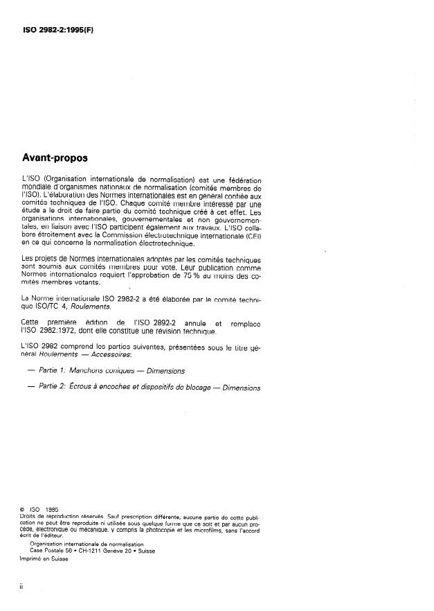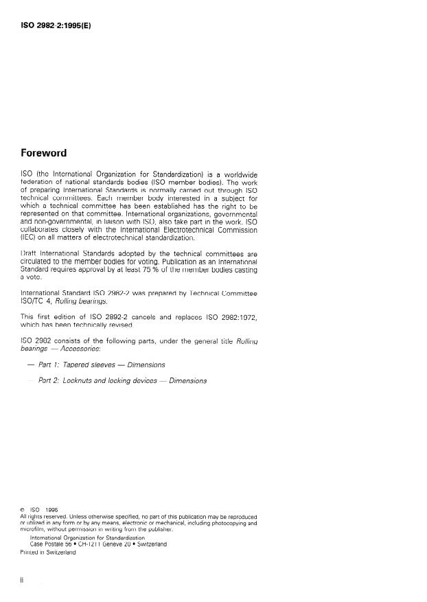 ISO 2982-2:1995 is a standard published by the International Organization for Standardization (ISO). Its full title is "Rolling bearings — Accessories — Part 2: Locknuts and locking devices — Dimensions". This standard covers: Rolling bearings — Accessories — Part 2: Locknuts and locking devices — Dimensions
