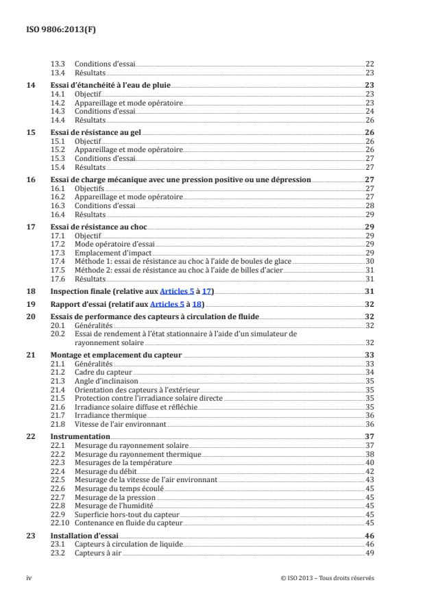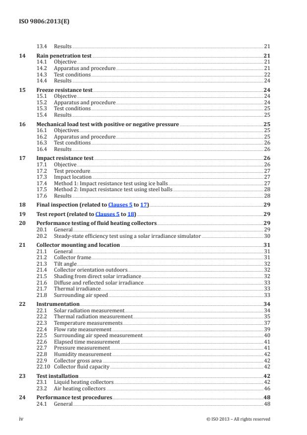 ISO 9806:2013 specifies test methods for assessing the durability, reliability and safety for fluid heating collectors. It also includes test methods for the thermal performance characterization of fluid heating collectors, namely steady-state and quasi-dynamic thermal performance of glazed and unglazed liquid heating solar collectors and steady-state thermal performance of glazed and unglazed air heating solar collectors (open to ambient as well as closed loop). It is also applicable to hybrid collectors generating heat and electric power. However it does not cover electrical safety or other specific properties related to electric power generation. ISO 9806:2013 is also applicable to collectors using external power sources for normal operation and/or safety purposes. ISO 9806:2013 is not applicable to those collectors in which the thermal storage unit is an integral part of the collector to such an extent that the collection process cannot be separated from the storage process for the purpose of making measurements of these two processes.
