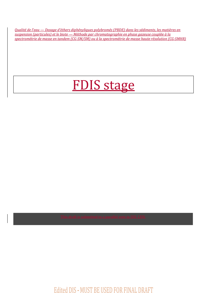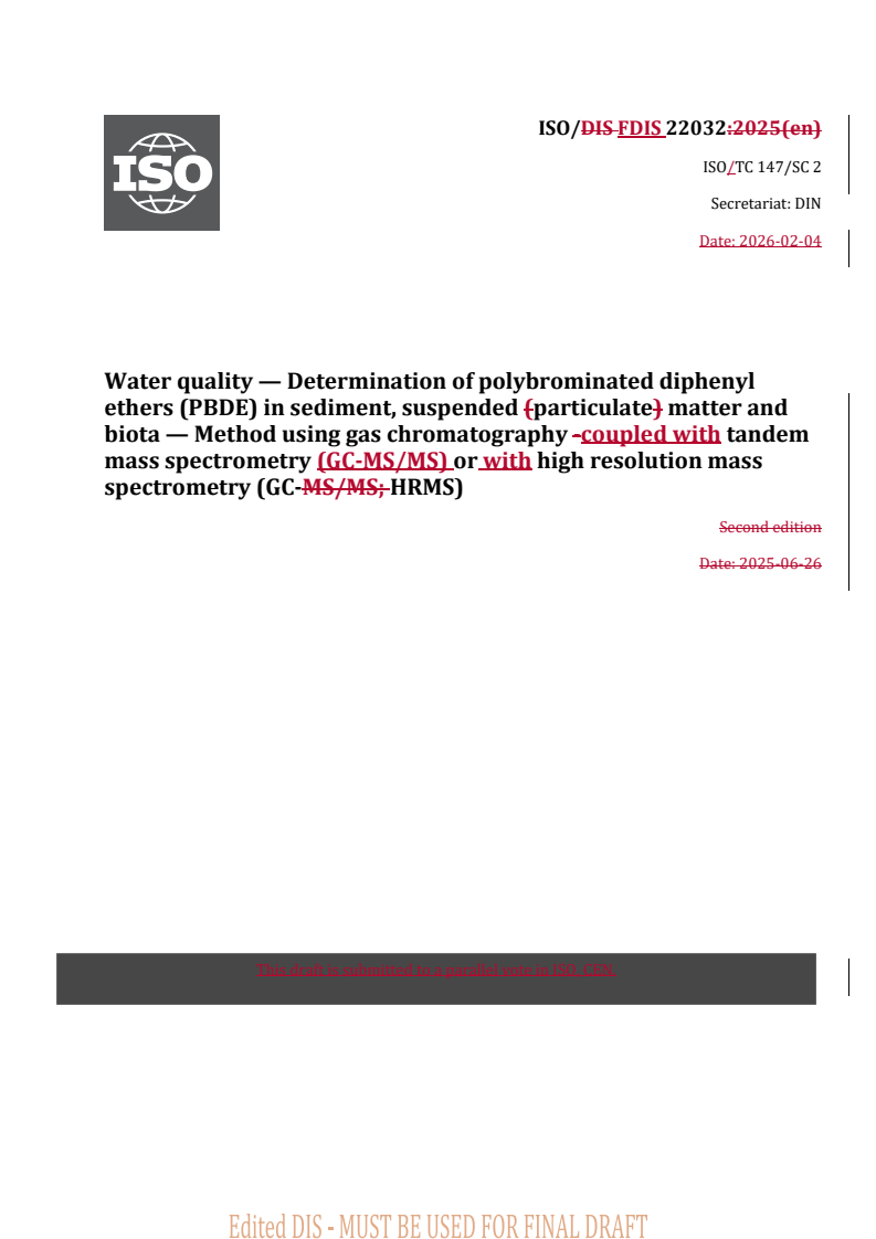 REDLINE ISO/FDIS 22032 - Water quality — Determination of polybrominated diphenyl ethers (PBDE) in sediment, suspended particulate matter and biota — Method using gas chromatography coupled with tandem mass spectrometry (GC-MS/MS) or with high resolution mass spectrometry (GC-HRMS) Released:5. 02. 2026