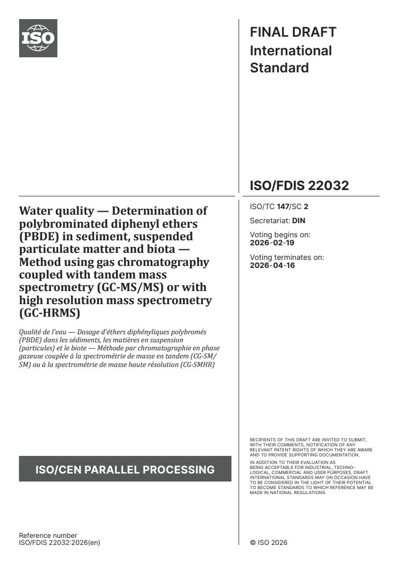 ISO/FDIS 22032 - Water quality — Determination of polybrominated diphenyl ethers (PBDE) in sediment, suspended particulate matter and biota — Method using gas chromatography coupled with tandem mass spectrometry (GC-MS/MS) or with high resolution mass spectrometry (GC-HRMS) Released:5. 02. 2026