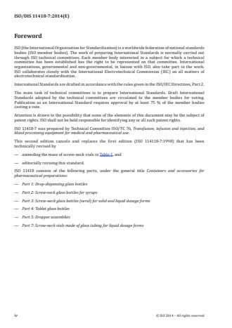 ISO 11418-7:2016 specifies the design, dimensions, material and requirements of screw-neck vials for pharmaceutical preparations. Screw-neck vials are applicable to primary packs used in direct contact with a drug. It applies to colourless or amber glass vials made from borosilicate or soda-lime-silica glass, made from glass tubing and intended to be used in the packaging, storage or transportation of pharmaceutical products. NOTE The potency, purity, stability and safety of a drug during its manufacture and storage can be strongly affected by the nature and performance of the primary pack.