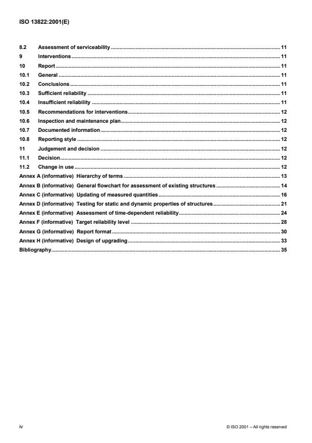 ISO 13822:2001 is a standard published by the International Organization for Standardization (ISO). Its full title is "Bases for design of structures — Assessment of existing structures". This standard covers: Bases for design of structures — Assessment of existing structures