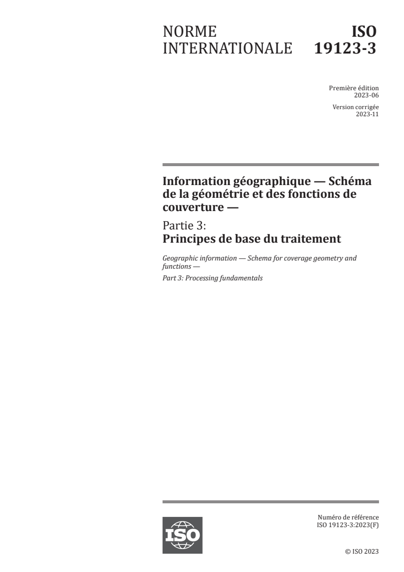 ISO 19123-3:2023 - Information géographique — Schéma de la géométrie et des fonctions de couverture — Partie 3: Principes de base du traitement Released:11/6/2023