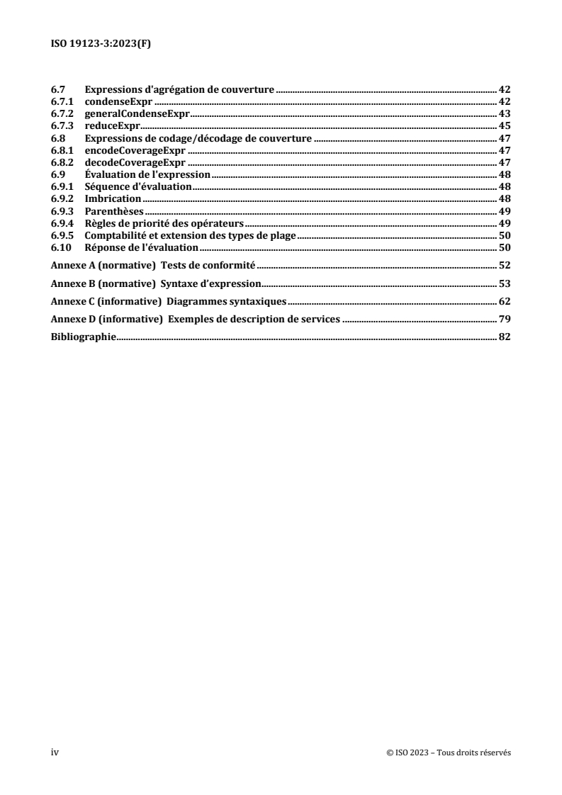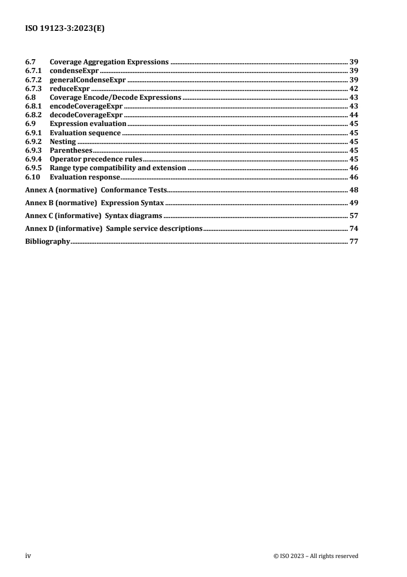 For implementers, review Annexes (conformance tests, expression syntax, sample service descriptions) to align service behavior and interoperability with ISO 19123-3:2023.