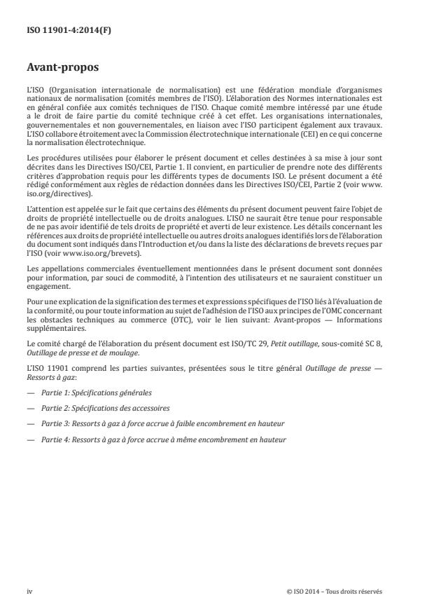 L'ISO 11901-4:2014 spécifie les dimensions, en millimètres, les forces nominales initiales et le type des ressorts à gaz. Elle est applicable aux ressorts à gaz à force accrue à même encombrement en hauteur de type 10 000 à 95 000, gonflés avec de l'azote avec une force nominale initiale comprise entre 10 000 N ± 5 % et 95 000 N ± 5 %, destinés à être utilisés dans les outillages de presse. Elle spécifie également le marquage, les conditions techniques de livraison et la désignation.