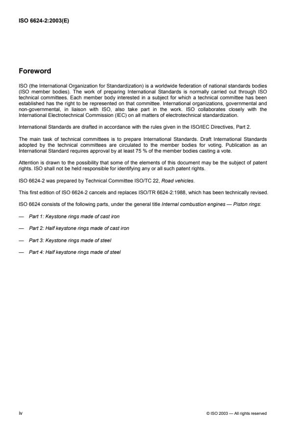 ISO 6624-2:2003 specifies the essential dimensional features of half keystone rings made of cast iron, types HK and HKB, having diameters of from 38 mm up to and including 160 mm, used in reciprocating internal combustion piston engines.