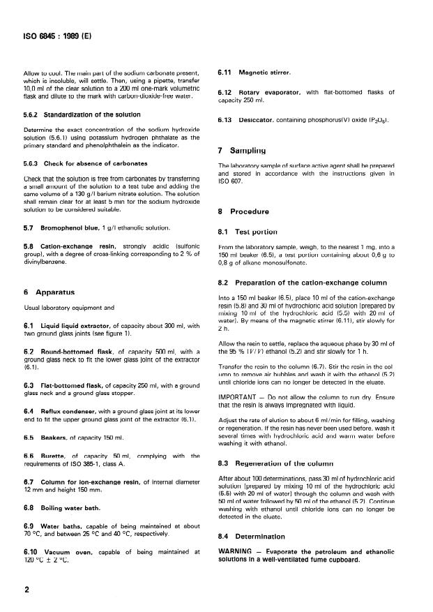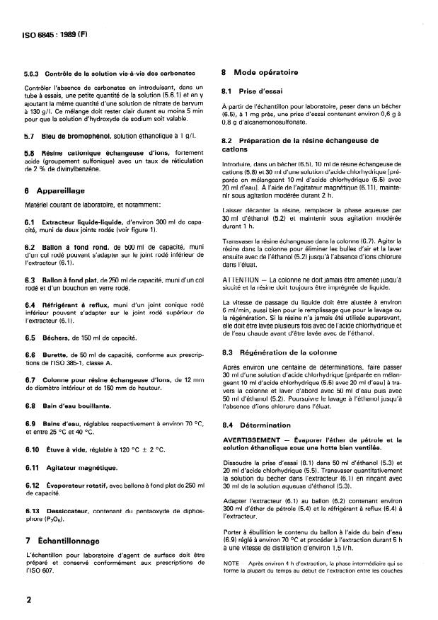 Refer to the full ISO 6845:1989 text for detailed apparatus dimensions, reagent preparations, stepwise procedure, calculation formulae and test reporting requirements.