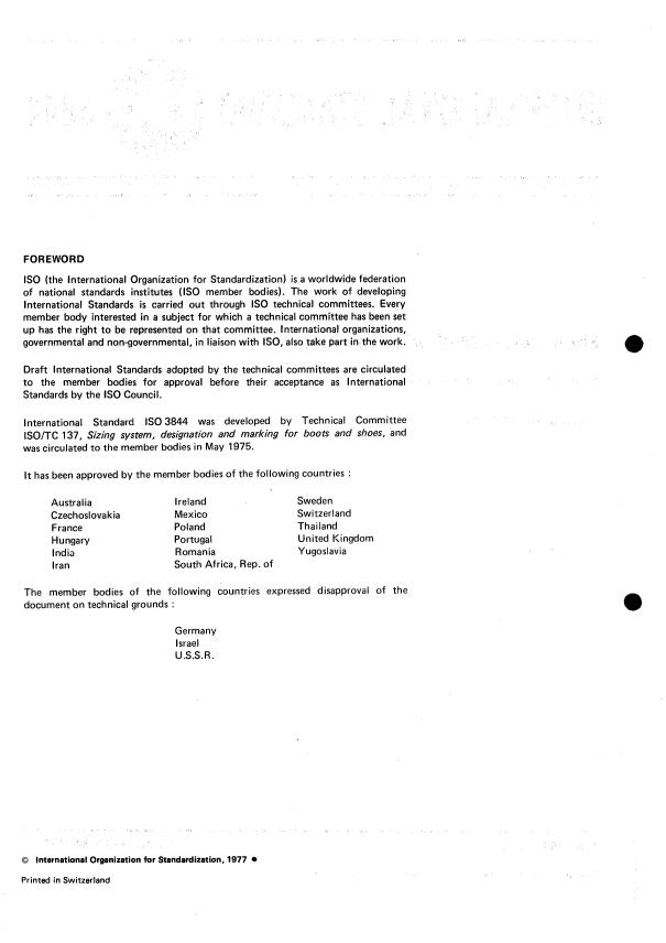 ISO 3844:1977 is a standard published by the International Organization for Standardization (ISO). Its full title is "Shoe sizes — Method of marking". This standard covers: Shoe sizes — Method of marking