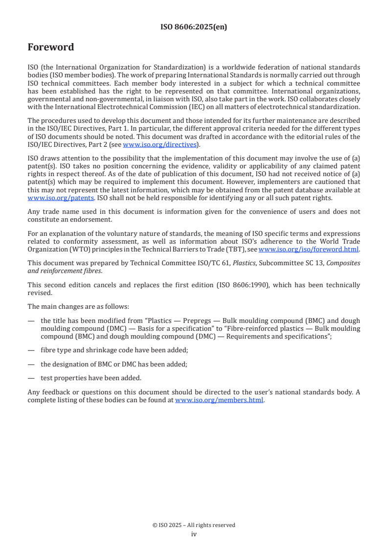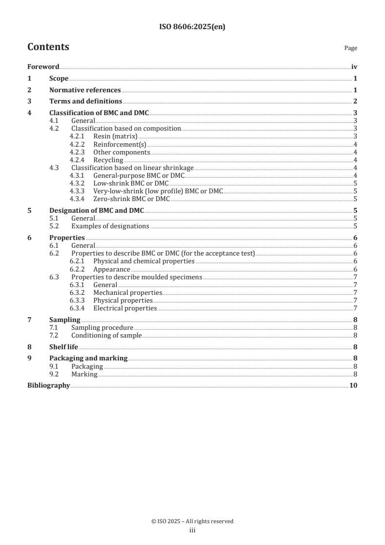 ISO 8606:2025 is a standard published by the International Organization for Standardization (ISO). Its full title is "Fibre-reinforced plastics - Bulk moulding compound (BMC) and dough moulding compound (DMC) - Requirements and specifications". This standard covers: This document establishes requirements and specifications of the bulk moulding compound (BMC) and dough moulding compound (DMC) with or without thickening agents. This document is applicable to BMC and DMC, which are different types of preimpregnated product used for the production, by moulding, of various parts made of composite materials. The scope is not limited to types of fibres and resins.