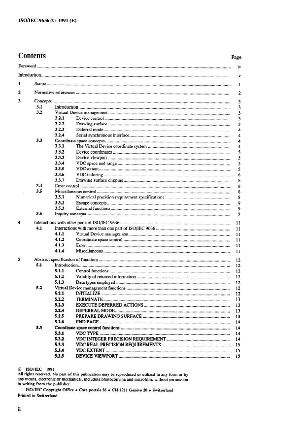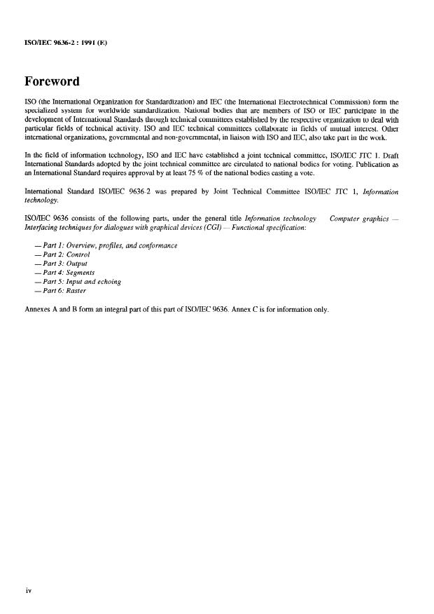 ISO/IEC 9636-2:1991 is a standard published by the International Organization for Standardization (ISO). Its full title is "Information technology - Computer graphics - Interfacing techniques for dialogues with graphical devices (CGI) - Functional specification - Part 2: Control". This standard covers: Describes those functions of the interface concerned with virtual device management, coordinate space control, and error control. Annexes A and B form an integral part of this standard. Annex C is for information only.