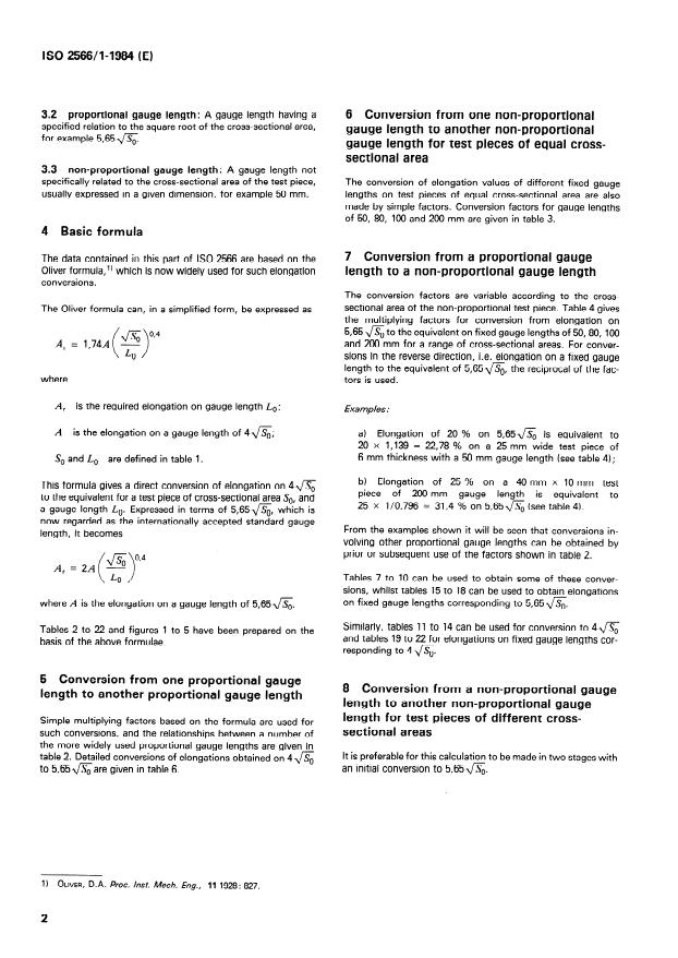 Specifies a method of converting room temperature percentage elongations after fracture obtained on various proportional and non-proportional gauge lengths to other gauge lengths. The conversions are not applicable to cold reduced steels, quenched and tempered steels and austenitic steels, or where certain tensile strength ranges and dimensions are exceeded.