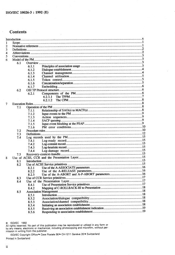 ISO/IEC 10026-3:1992 is a standard published by the International Organization for Standardization (ISO). Its full title is "Information technology — Open Systems Interconnection — Distributed Transaction Processing — Part 3: Protocol specification". This standard covers: Information technology — Open Systems Interconnection — Distributed Transaction Processing — Part 3: Protocol specification