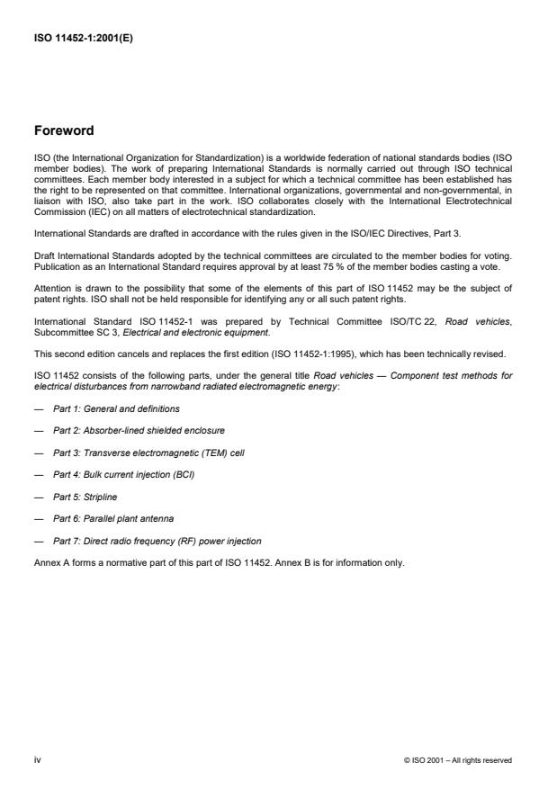 ISO 11452-1:2001 - Road vehicles -- Component test methods for electrical disturbances from narrowband radiated electromagnetic energy
