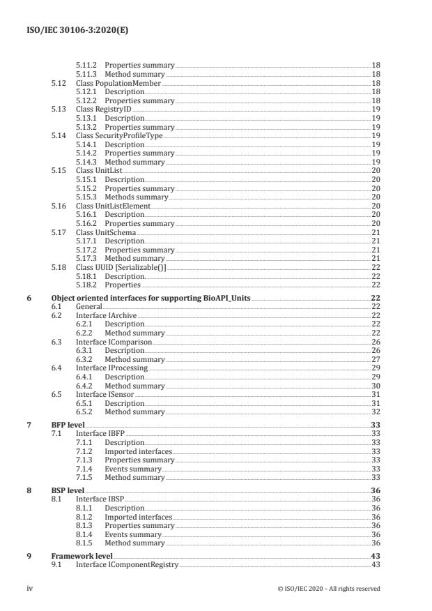 - Object‑oriented interfaces: Specification of interfaces to support BioAPI units and BSP behavior - examples include IArchive, IComparison, IProcessing, ISensor, and IBFP. The standard documents their purpose, properties, events and method summaries.