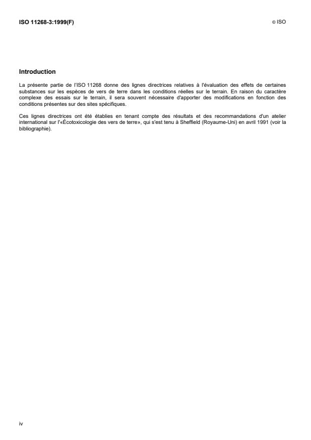 ISO 11268-3:1999 is a standard published by the International Organization for Standardization (ISO). Its full title is "Soil quality — Effects of pollutants on earthworms — Part 3: Guidance on the determination of effects in field situations". This standard covers: Soil quality — Effects of pollutants on earthworms — Part 3: Guidance on the determination of effects in field situations