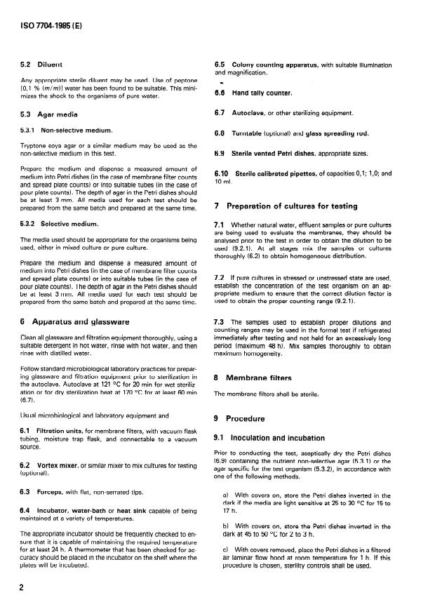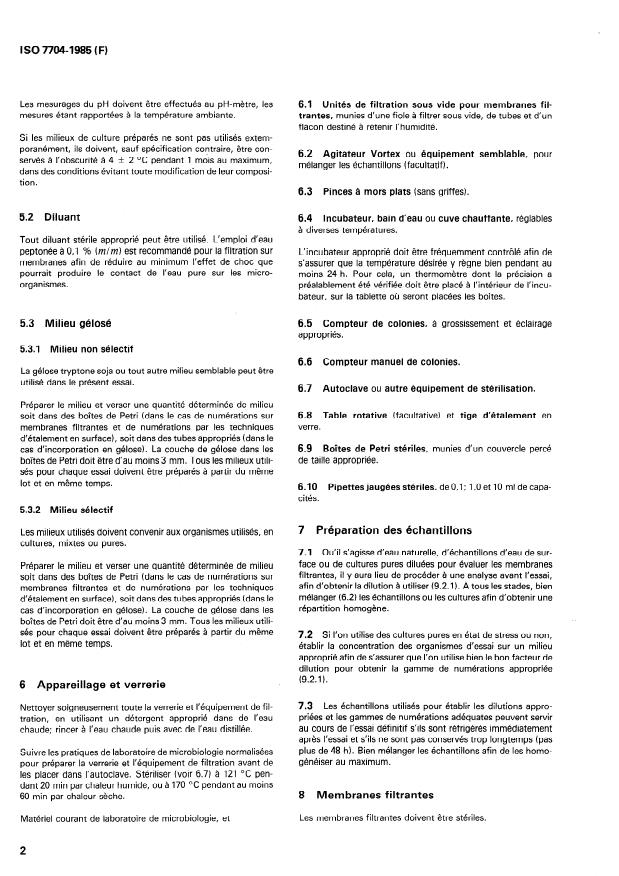 ISO 7704:1985 is a standard published by the International Organization for Standardization (ISO). Its full title is "Water quality — Evaluation of membrane filters used for microbiological analyses". This standard covers: Gives a procedure for the evaluation and comparison of water-testing filters intended for the enumeration of specific organisms and mixed microbial populations. The procedure provides general guidelines for comparative testing of the recoveries of bacteria, yeasts and other fungi on membrane filters, as compared to recoveries by the spread plate and pour plate techniques.