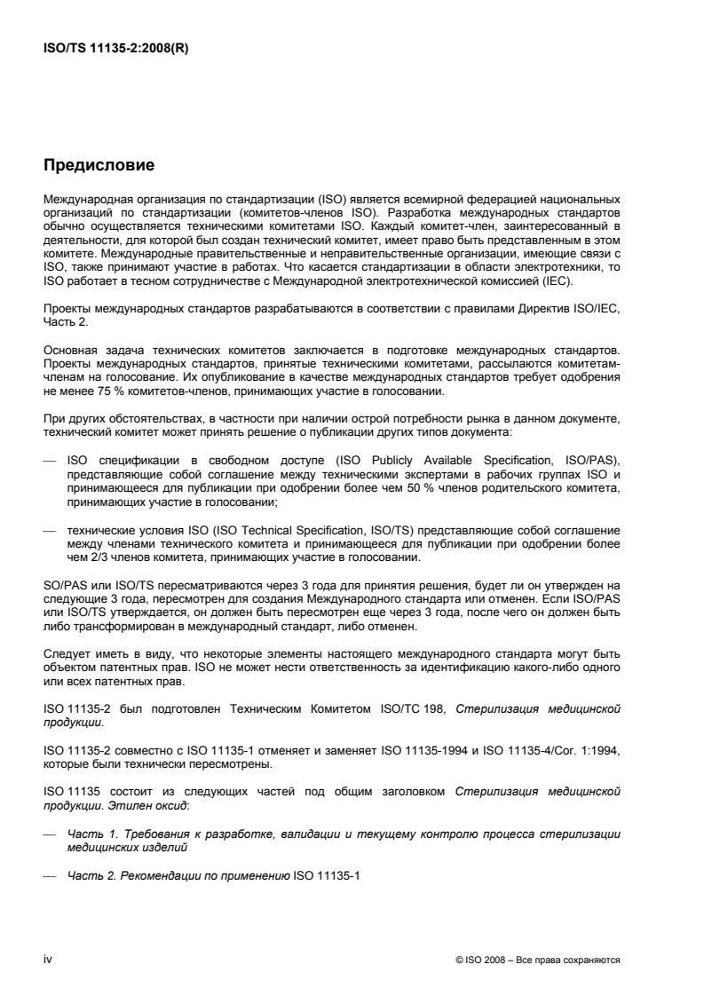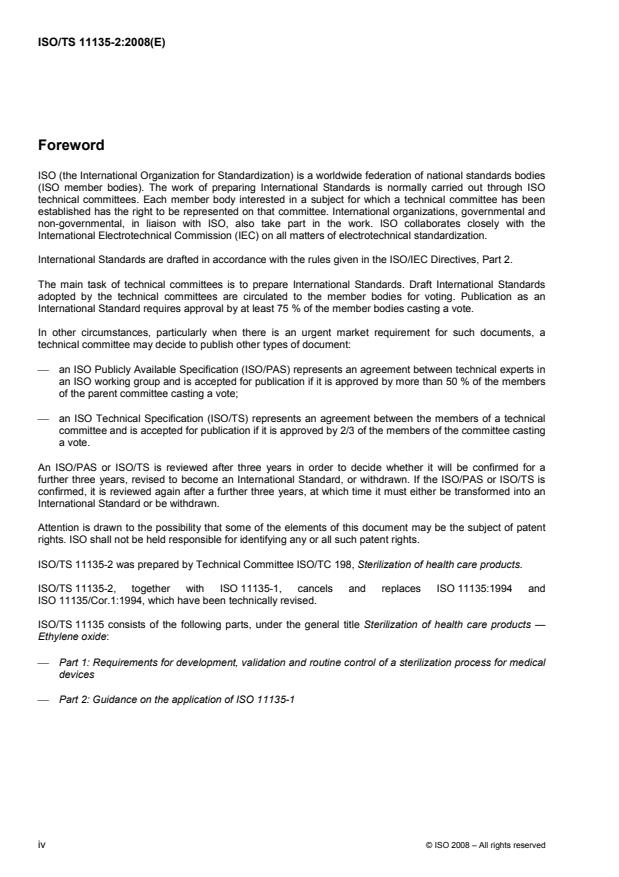 ISO/TS 11135-2:2008 is a technical specification published by the International Organization for Standardization (ISO). Its full title is "Sterilization of health care products — Ethylene oxide — Part 2: Guidance on the application of ISO 11135-1". This standard covers: ISO/TS 11135-2:2008 provides guidance for the requirements in ISO 11135-1:2007. It does not repeat the requirements and is not intended to be used in isolation. The exclusions in ISO 11135-1 apply also to this Technical Specification. This guidance document is intended for people who have a basic knowledge of the principles of EO sterilization but may need help in determining how to best meet the requirements contained in ISO 11135-1. This document is not intended for people lacking a basic knowledge of the principles of EO sterilization.