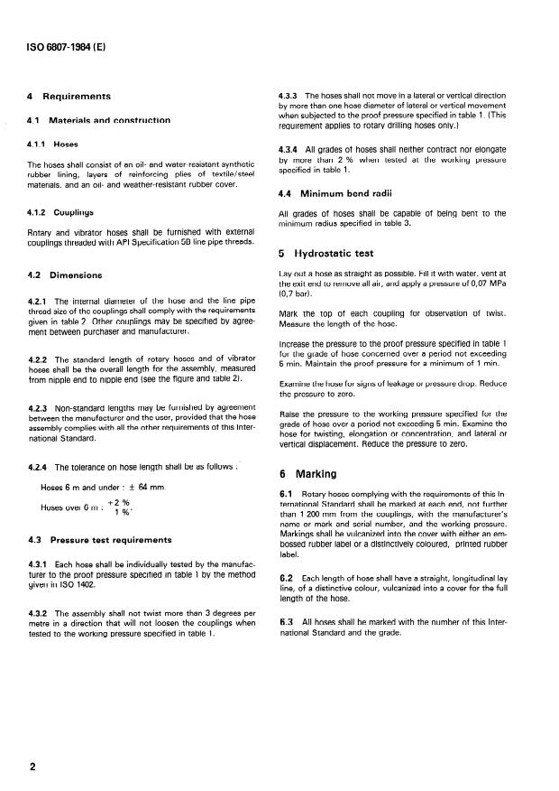ISO 6807:1984 is a standard published by the International Organization for Standardization (ISO). Its full title is "Rubber hoses and hose assemblies for rotary drilling and vibration applications — Specification". This standard covers: Requirements for textile- and steel-reinforced hoses are specified for use with water- and/or oil-based muds with a minimum aniline point of 66 °C pumped at high pressure in large volumes. The hoses are suitable for use at temperatures up to 80 °C and are reistant to ageing, to tropical conditions and to ambient temperatures down to -30 °C. 3 tables and 1 figure give detailed requirements.