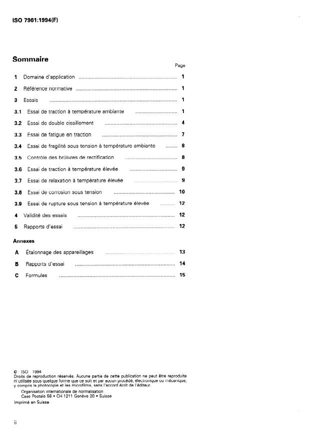 ISO 7961:1994 is a standard published by the International Organization for Standardization (ISO). Its full title is "Aerospace — Bolts — Test methods". This standard covers: Specifies the following test methods: tensile test at ambient temperature, double shear test, tension fatigue test, stress durability test at ambient temperature, inspection for grinding burns, tensile test at elevated temperature, stress relaxation test at elevated temperature, stress corrosion test, stress rupture test at elevated temperature. Also describes test validity and test reports.