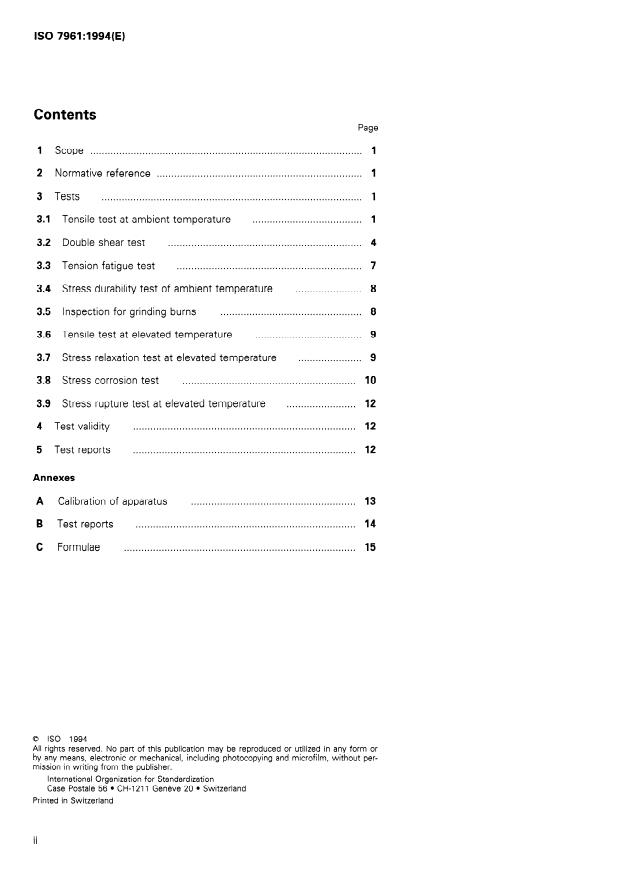 Specifies the following test methods: tensile test at ambient temperature, double shear test, tension fatigue test, stress durability test at ambient temperature, inspection for grinding burns, tensile test at elevated temperature, stress relaxation test at elevated temperature, stress corrosion test, stress rupture test at elevated temperature. Also describes test validity and test reports.