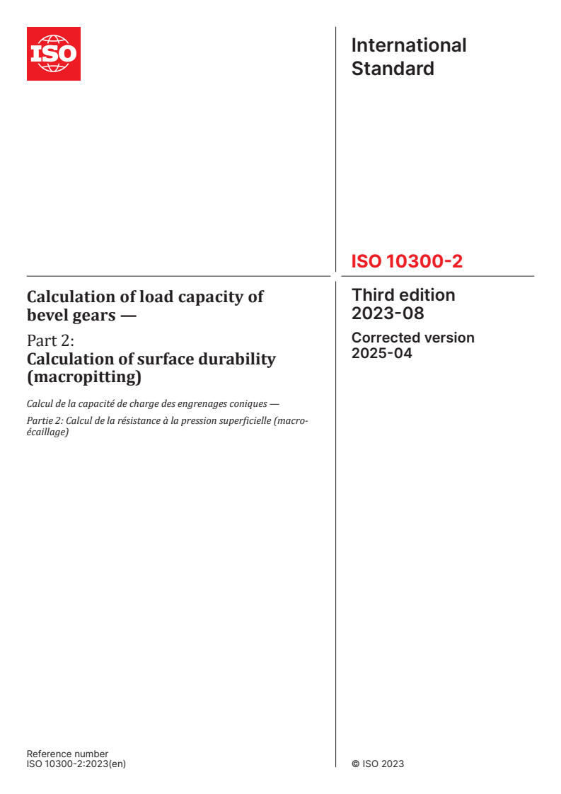 ISO 10300-2:2023 - Calculation of load capacity of bevel gears — Part 2: Calculation of surface durability (macropitting) Released:4/28/2025
