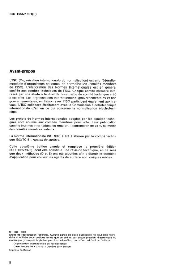 ISO 1065:1991 is a standard published by the International Organization for Standardization (ISO). Its full title is "Non-ionic surface-active agents obtained from ethylene oxide and mixed non-ionic surface-active agents - Determination of cloud point". This standard covers: Specifies five methods of measurement. Methods A, B and C are applicable to agents derived by condensation with a lipophilic compound without oxypropylene groups. Methods D and E should be used only after agreement between the parties concerned. This second edition cancels and replaces the first edition (1975).