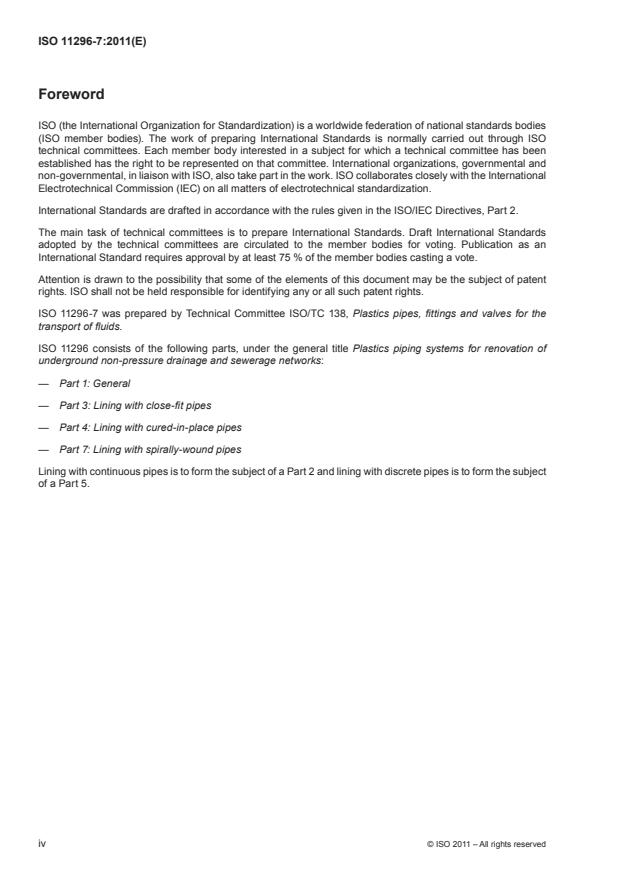 ISO 11296-7:2011 is a standard published by the International Organization for Standardization (ISO). Its full title is "Plastics piping systems for renovation of underground non-pressure drainage and sewerage networks — Part 7: Lining with spirally-wound pipes". This standard covers: Plastics piping systems for renovation of underground non-pressure drainage and sewerage networks — Part 7: Lining with spirally-wound pipes
