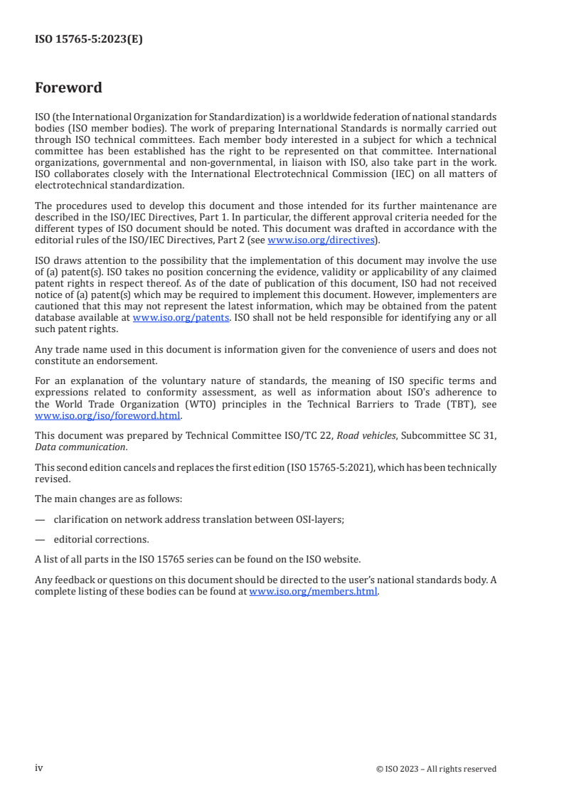 - Document provenance: Second edition (2023), replacing ISO 15765-5:2021; main changes include clarifications on network address translation between OSI layers and editorial corrections.