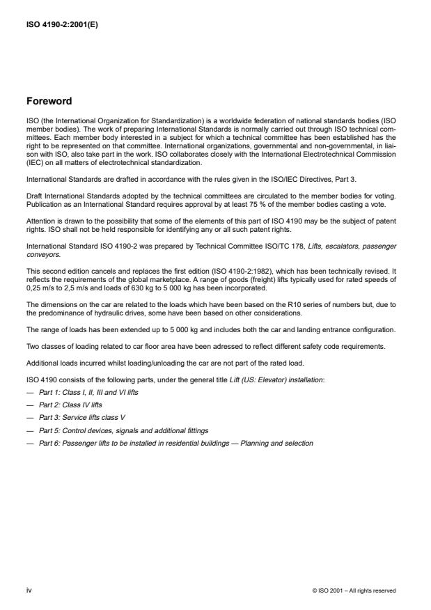 ISO 4190-2:2001 is a standard published by the International Organization for Standardization (ISO). Its full title is "Lift (US: Elevator) installation — Part 2: Class IV lifts". This standard covers: This part of ISO 4190 specifies the necessary dimensions to permit the installation of Class IV lifts, as defined in 3.2.4, generally used for the transport of goods (freight). It deals with electric and hydraulic lifts. The horizontal dimensions of the wells (US: hoistways) are generally defined by the entrance and drive configurations. It covers lifts with either horizontal or vertical power-operated sliding doors [see Figures 1 a) and 1 b)]. For other characteristics, the manufacturers should be consulted. This part of ISO 4190 is applicable to new lift installations, with a car with one or two entrances, to be installed in a new building. Where relevant, it may be used as a basis for an installation in an existing building. Two types of loading (load per unit area) are addressed: Series A: passenger and goods (freight) lifts with loading conforming to EN 81-1 or EN 81-2; Series B: lifts for goods (freight) only, which have a different floor loading in countries which allow this by virtue of their safety codes.