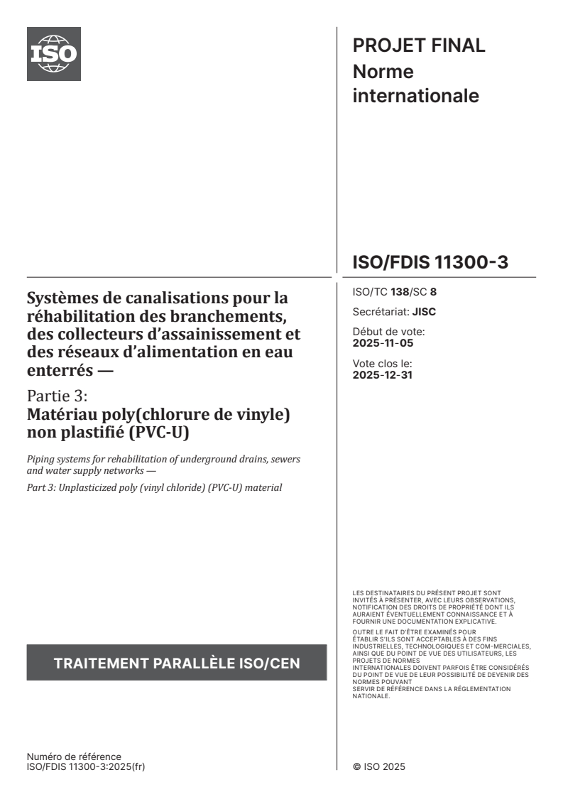 ISO/FDIS 11300-3 - Systèmes de canalisations pour la réhabilitation des branchements, des collecteurs d’assainissement et des réseaux d’alimentation en eau enterrés — Partie 3: Matériau poly(chlorure de vinyle) non plastifié (PVC-U) Released:16. 12. 2025