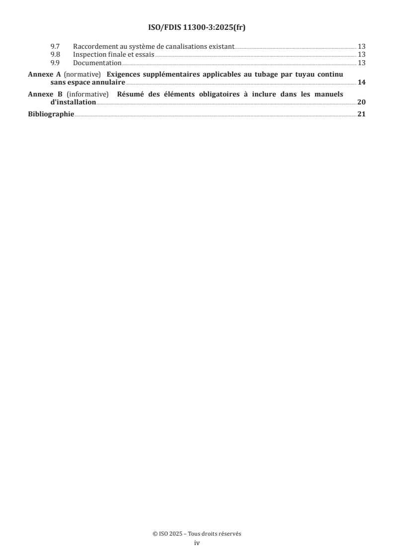 - Normative and informative annexes: Annex A contains additional normative requirements specific to close‑fit lining; Annex B summarizes required elements for installation manuals.