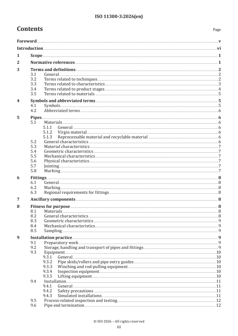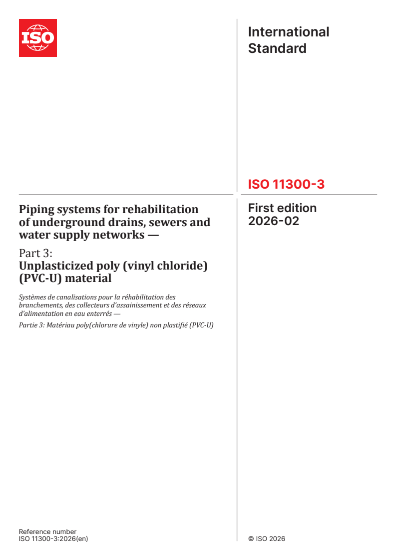 ISO 11300-3:2026 is a standard published by the International Organization for Standardization (ISO). Its full title is "Piping systems for rehabilitation of underground drains, sewers and water supply networks — Part 3: Unplasticized poly (vinyl chloride) (PVC-U) material". This standard covers: This document specifies requirements and test methods for pipes and fittings which are part of piping systems for the rehabilitation of non-pressure underground drains and sewers. NOTE It is not applicable to use of PVC-U material for rehabilitation of pipes under pressure. It is applicable to unplasticized poly (vinyl chloride) (PVC-U) pipes, fittings and assemblies, as manufactured and as installed with service temperature not exceeding 35 °C. It is not applicable to the existing pipeline. This document is applicable to the renovation technique family “lining with close-fit pipes”.