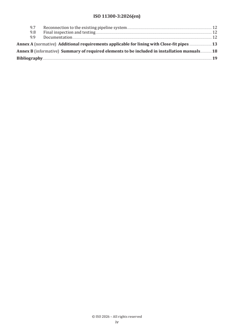 - Normative and informative annexes: Annex A contains additional normative requirements specific to close‑fit lining; Annex B summarizes required elements for installation manuals.