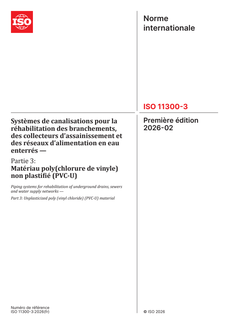 ISO 11300-3:2026 - Systèmes de canalisations pour la réhabilitation des branchements, des collecteurs d’assainissement et des réseaux d’alimentation en eau enterrés — Partie 3: Matériau poly(chlorure de vinyle) non plastifié (PVC-U) Released:3. 02. 2026