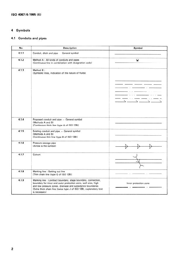 ISO 4067-6:1985 is a standard published by the International Organization for Standardization (ISO). Its full title is "Technical drawings — Installations — Part 6: Graphical symbols for supply water and drainage systems in the ground". This standard covers: Establishes basic symbols for conduits, pipes and ditches including fabricated parts and equipment. Symbols are shown and used primaily in plans, but they can in applicable cases also be used in sections, cuts and elevations. This part of ISO 4067 will be modified as soon as results are available from the work concerning the coordination of symbols for use in drawings in all technical areas.