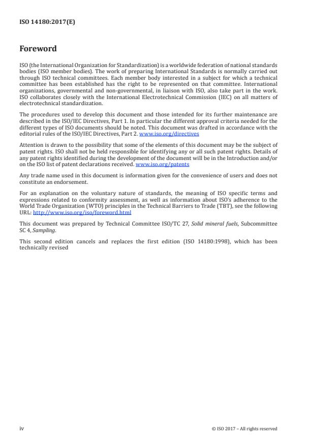 ISO 14180:2017 is a standard published by the International Organization for Standardization (ISO). Its full title is "Solid mineral fuels — Guidance on the sampling of coal seams". This standard covers: ISO 14180:2017 provides guidance on methods for taking samples from coal seams in the ground, whether from exploration areas or tenements, or from operating underground or open-cut mines. The following methods are described: a) sampling of small or large diameter holes; b) drill cuttings sampling; c) open-cut slot sampling; d) adit, drift or shaft sampling; e) pillar sampling; f) channel sampling; g) strip sampling. ISO 14180:2017 does not apply to sampling from moving streams in production or any other source of coal that is not in situ. Recommendations are made for selection and preparation of the sampling site, and methods are described for taking both small and bulk samples, and for preparing the samples for transport. NOTE Annex A gives an example of a channel sample record form that can be used to record sampling and other relevant data, and ISO 13909 or ISO 18283 describes how to determine the mass of a representative sample at various nominal top sizes.