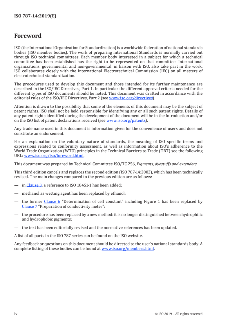ISO 787-14:2019 is a standard published by the International Organization for Standardization (ISO). Its full title is "General methods of test for pigments and extenders - Part 14: Determination of resistivity of aqueous extract". This standard covers: This document specifies a general method of test for determining the electric resistivity (specific electric resistance) or the specific electric conductivity, respectively, of the aqueous extract of a pigment. The method is applicable to all pigments and extenders, except pigments that are soluble in water. The resistivity of the aqueous extract of a pigment is considered as a property independent of the amount of water-soluble matter. If agreed, a cold extraction method can be used.