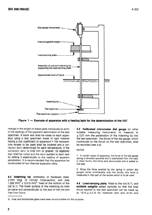ISO 306:1994 is a standard published by the International Organization for Standardization (ISO). Its full title is "Plastics — Thermoplastic materials — Determination of Vicat softening temperature (VST)". This standard covers: Specifies four methods for the determination: method A50 using a force of 10 N and a heating rate of 50 °C/h, method B50 using a force of 50 N and a heating rate of 50 °C/h, method A120 using a force of 10 N and a heating rate of 120 °C/h, method B120 using a force of 50 N and a heating rate of 120 °C/h. The principle is determining the temperature at which a standard indenter penetrates 1 mm into the surface. The methods are applicable only to thermoplastics, for which they give a measure of the temperature at which the thermoplastics start to soften rapidly.