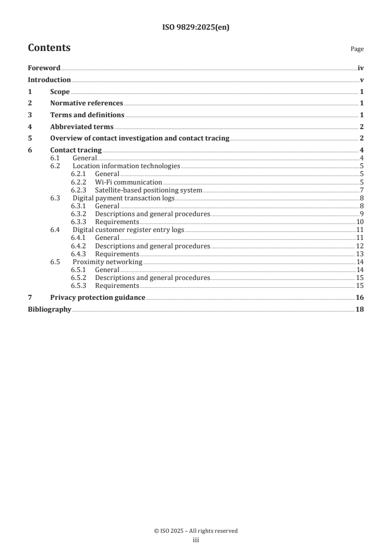 ISO 9829:2025 addresses both procedural and technical aspects of contact tracing. Major topics include: