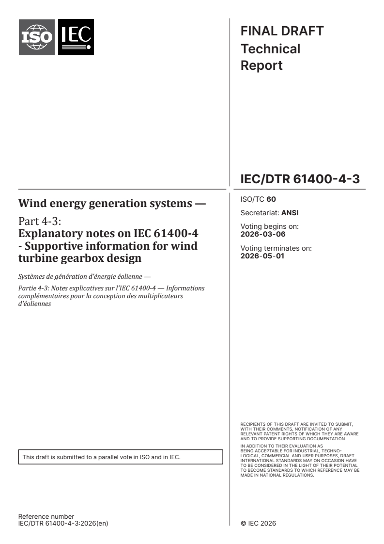 IEC/DTR 61400-4-3 is a draft published by the International Organization for Standardization (ISO). Its full title is "Wind energy generation systems — Part 4-3: Explanatory notes on IEC 61400-4 - Supportive information for wind turbine gearbox design". This standard covers: Wind energy generation systems — Part 4-3: Explanatory notes on IEC 61400-4 - Supportive information for wind turbine gearbox design